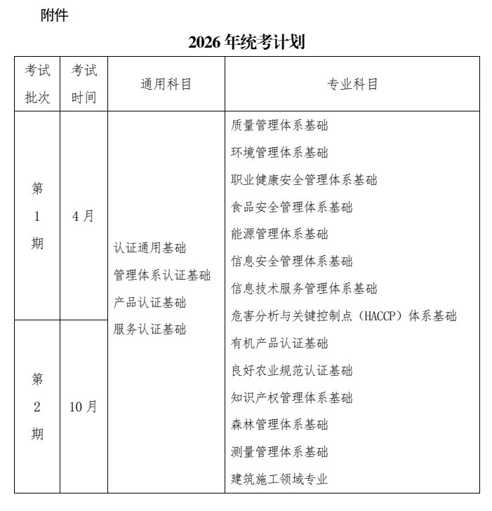 Post navigation ← Previous Next → 中国认证认可协会关于2026年认证人员注册全国统一考试安排的通知 Posted on 2025/08/14 by admin 中国认证认可协会关于2026年认证人员注册全国统一考试安排的通知 各相关机构及人员: 为方便考生全面了解认证人员注册全国统一考试(简称统考)安排,合理安排报考,现将2026年考试计划予以公布(详见附件)。 具体考试时间、考点、场次安排及其他报名事宜详见每期统考报名通知。 附件:2026年统考计划 中国认证认可协会 2026年3月3日 附件 分享到: QQ空间 新浪微博 腾讯微博 人人网